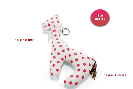Κρεμαστό λούτρινο διακοσμητικό καμηλοπάρδαλη σε λευκή απόχρωση με κόκκινα πουά.