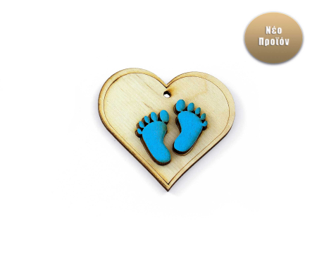 Κρεμαστό ξύλινο διακοσμητικό καρδούλα διακοσμημένη με παιδικά πατουσάκια σε γαλάζια απόχρωση.