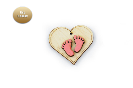 Κρεμαστό ξύλινο διακοσμητικό καρδούλα διακοσμημένη με παιδικά πατουσάκια σε ροζ απόχρωση.