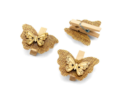 Μανταλάκι ξύλινο διακοσμητικό με ξύλινη πεταλούδα και ύφασμα λινάτσα, σε φυσική απόχρωση.