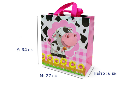 Ανακυκλώσιμη και φιλική προ το περιβάλλον υφασμάτινη τσάντα με χεράκι σε ροζ απόχρωση με εκτύπωση αγελαδίτσα.