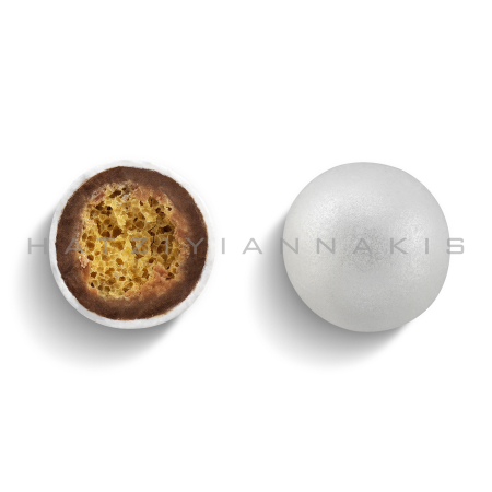 Τραγανός πυρήνας δημητριακών από καβουρδισμένο ρύζι, με επικάλυψη σοκολάτας γάλακτος & λεπτή επίστρωση ζάχαρης σε λευκό περλέ χρωματισμό.