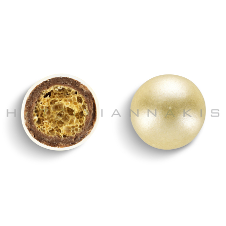 Τραγανός πυρήνας δημητριακών από καβουρδισμένο ρύζι, με επικάλυψη σοκολάτας γάλακτος & λεπτή επίστρωση ζάχαρης σε σαμπανί περλέ χρωματισμό.
