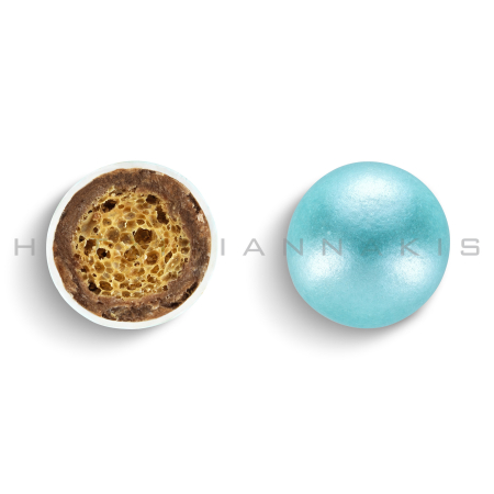Τραγανός πυρήνας δημητριακών από καβουρδισμένο ρύζι, με επικάλυψη σοκολάτας γάλακτος & λεπτή επίστρωση ζάχαρης σε σιέλ περλέ χρωματισμό.