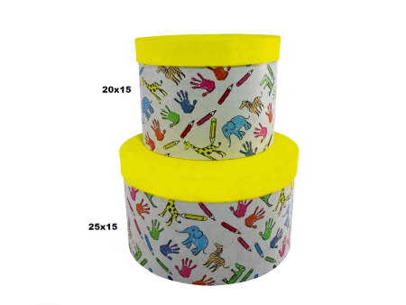Κουτί χειροποίητο, στρογγυλό, καπελλιέρα, φτιαγμένο από σκληρό χαρτόνι, με κίτρινο καπάκι επενδεδυμένο εξωτερικά με σχέδιο παιδικές παλάμες, ελέφαντες και καμηλοπαρδάλεις.