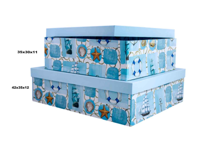 Κουτί φτιαγμένο από σκληρό χαρτόνι με σιέλ καπάκι επενδεδυμένο εξωτερικά με ναυτικό θέμα.