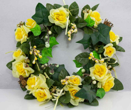 Στεφανάκι με κίτρινα τριανταφυλλάκια από ύφασμα με διάμετρο 25 εκατοστά.