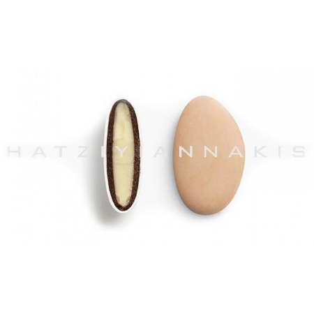 Κουφέτα με λευκή σοκολάτα & σοκολάτα (55% κακάο) με λεπτή επικάλυψη ζάχαρης, σε σομόν ματ απόχρωση, με γεύση πορτοκάλι.