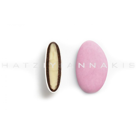 Κουφέτα με λευκή σοκολάτα & σοκολάτα (55% κακάο) με λεπτή επικάλυψη ζάχαρης, σε ροζ ανοιχτή ματ απόχρωση, με γεύση φράουλα.