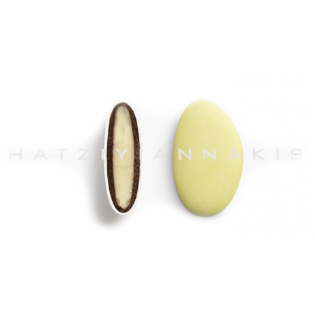 Κουφέτα με λευκή σοκολάτα & σοκολάτα (55% κακάο) με λεπτή επικάλυψη ζάχαρης, σε κίτρινη ανοιχτή ματ απόχρωση, με γεύση zabaglione.