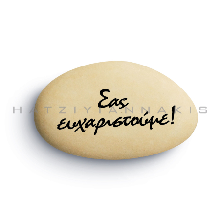 Τυπωνένα κουφέτα από το κορυφαίο κουφέτο bijoux supreme με γέμιση εξαιρετικής σοκολάτας (70% κακάο) και μια λεπτή επικάλυψη ζάχαρης, σε κρεμ ματ απόχρωση. Η γραμματοσειρά είναι σε μαύρο χρώμα.