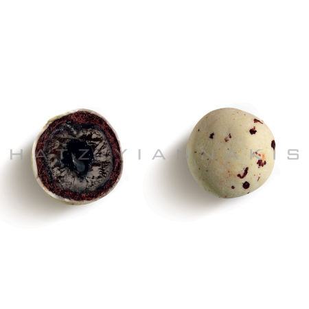 Κουφέτα που μοιάζουν με αληθινά βότσαλα με ολόκληρο σιροπιαστό βύσσινο και σοκολάτα (70% κακάο) με λεπτή επικάλυψη ζάχαρης.