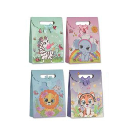 Χάρτινες τσάντες πλαστικοποιημένες με σχέδιο ελεφαντάκι, λιονταράκι, ζέβρα και τιγράκι. Το κλείσιμο είναι με ταινία velcro.