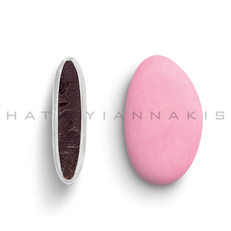 Κουφέτα από φυσικό εκχύλισμα βανίλιας με σοκολάτα (70% κακάο) με λεπτή επικάλυψη ζάχαρης σε ροζ ανοιχτή ματ απόχρωση.
