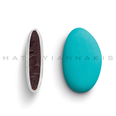 Κουφέτα από φυσικό εκχύλισμα βανίλιας με σοκολάτα (70% κακάο) με λεπτή επικάλυψη ζάχαρης σε τιρκουάζ ματ απόχρωση.