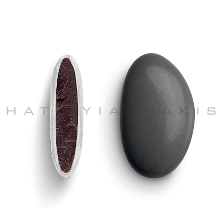 Κουφέτα από φυσικό εκχύλισμα βανίλιας με σοκολάτα (70% κακάο) με λεπτή επικάλυψη ζάχαρης σε ανθρακί γυαλιστερή απόχρωση.