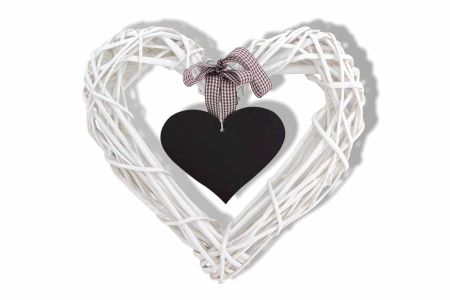 Στεφάνι φτιαγμένο από κλαδιά σε σχήμα καρδιάς βαμμένο σε λευκό χρώμα, με κρεμαστή μαύρη καρδιά στη μέση, διακοσμιμένη με κορδέλα καρώ.