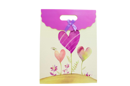 Τσάντα χειροποίητη πλαστικοποιημένη, με πολύχρωμα σχέδια με θέμα "φύλλοκαρδιά" σε λιλά απόχρωση.