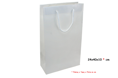 Τσάντα χάρτινη χειροποιήτη ριγέ με κορδόνι, σε λευκή απόχρωση.
