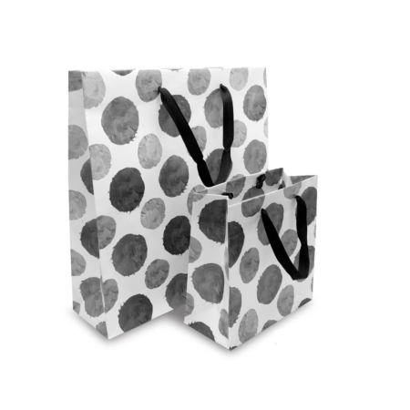 Πρόσθεσε κομψότητα και αισθητική στη συσκευασία σου με αυτές τις χειροποίητες πλαστικοποιημένες τσάντες, σε λευκή βάση με μαύρα και γκρι πουά. Η πλαστικοποιημένη επιφάνεια προσφέρει αυξημένη αντοχή και προστασία, ενώ το μοντέρνο πουά μοτίβο τις κάνει ιδανικές για δώρα.