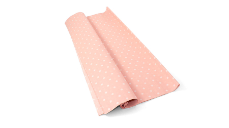 Χαρτί αφής από 100% καθαρό ή ανακυκλωμένο χαρτοπολτό, σε ρολό των10 φύλλων, με λευκά πουά σε ροζ χρώμα.