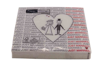 Χαρτοπετσέτες πολυτελείας με σχέδιο "just married", σε συσκευασία των 20 τεμαχίων.