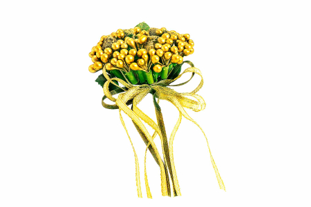 Χριστουγεννιάτικο στεφανάκι από πλαστικά λουλουδάκια γκι βαμμένα σε χρυσή απόχρωση διακοσμημένο με πράσινες και χρυσές κορδέλες, με διάμετρο 10 εκατοστά.