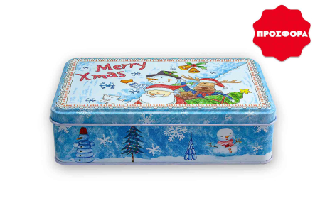 Υψηλής ποιότητας μεταλλικό χριστουγεννιάτικο κουτί με μεταλλικο καπάκι σε γαλάζιο χρώμα και τύπωμα χιονάνθρωπους και logo "Merry Xmas".